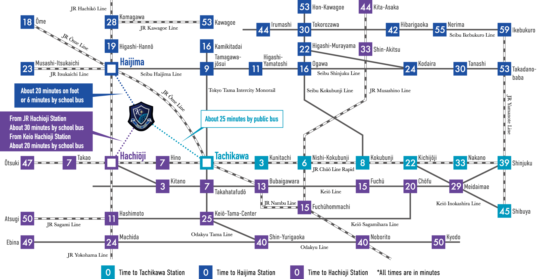 About 20 minutes on foot or 6 minutes by school bus, departing approximately every 15 minutes throughout the day