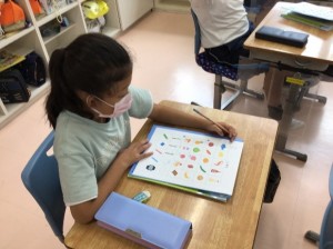楽しかった夏休みが終わりました。2学期初めの授業では、子どもたちと、夏休みに食べた美味しかったものの話や自由研究でどんなものを作ったか話したりしながら、少しずつ英語の授業モードに戻していきました。3年生では、”How much is the apple?” のように、物の値段をたずねる表現を学習しています。