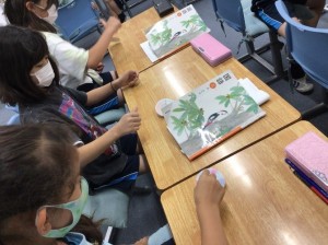 「早く回すと、色が混ざるよ。だから色変わりごまは楽しいんだね!」お互いこまの色の変化を見せ合い、楽しみながら説明文を学ぶことができました。