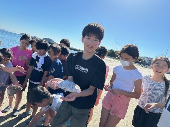 2日目は、日間賀島で漁業体験を行いました。しらす工場見学、地引き網、干物作り、つかみ取り、4つの体験をしました。地引き網では、みんなで力を合わせて縄を引くと、網の中にはたくさんの魚が入っていて、子どもたちは大興奮でした。