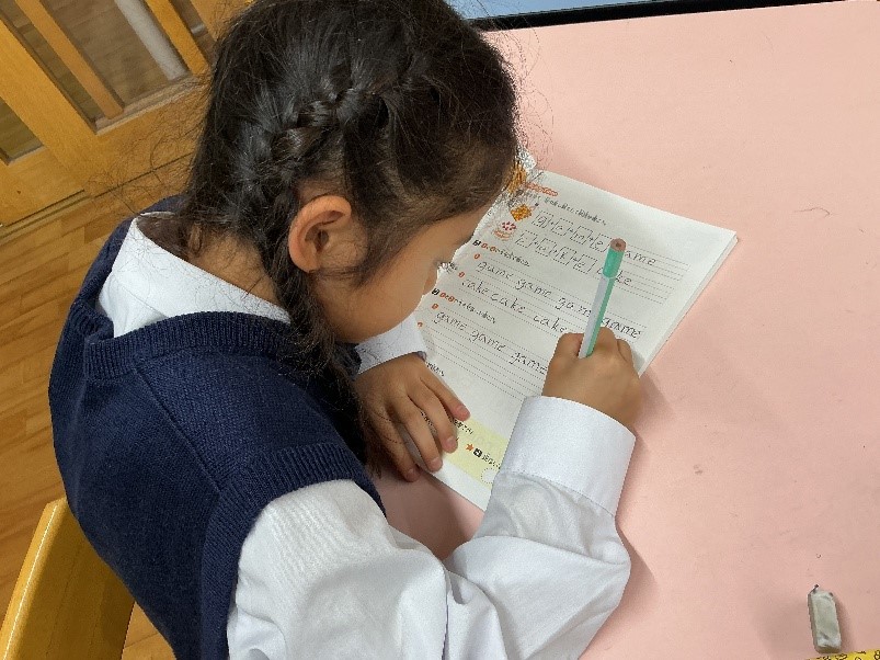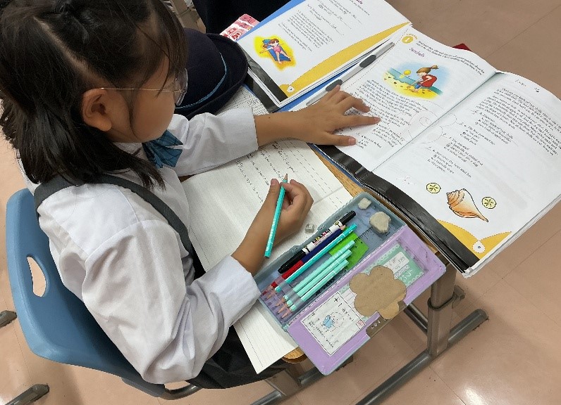 低学年の児童は、アルファベットを書く練習や、リスニングの練習に真剣に取り組んでいます。先生にチェックしてもらいながら、アルファベットを正しく綺麗に書く練習をしたり、また、文法のワークブックを進める児童もいます。