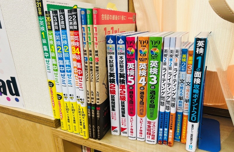 英語教室には、英検対策の練習問題など参考書が並んでいます。時には、児童が、次に合格を目指したい級の過去の問題を見に来たり、相談をしたりしに来ます。