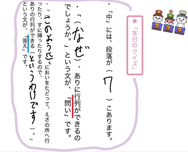 「あっ、『問い』の文の次から、『中』の段落が始まってる!だから、『ありの行列』も同じかも。」