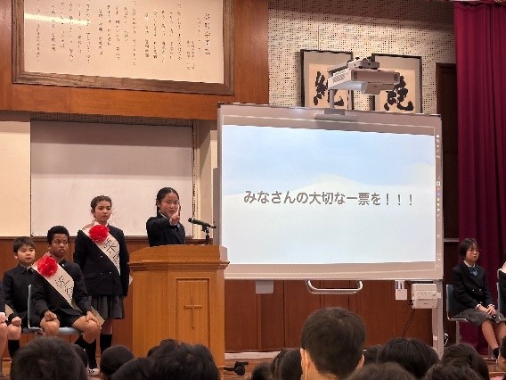 立ち会い演説会本番、「自分がもし児童会役員になったら○○をしたいです!」という思いを一人ひとりが自分の言葉で伝えていました。また、「私に清き一票をよろしくお願いします!」と、最後は力強い言葉で演説を締めくくりました。全校の前で、自分の思いを堂々と伝える姿は素晴らしかったです。