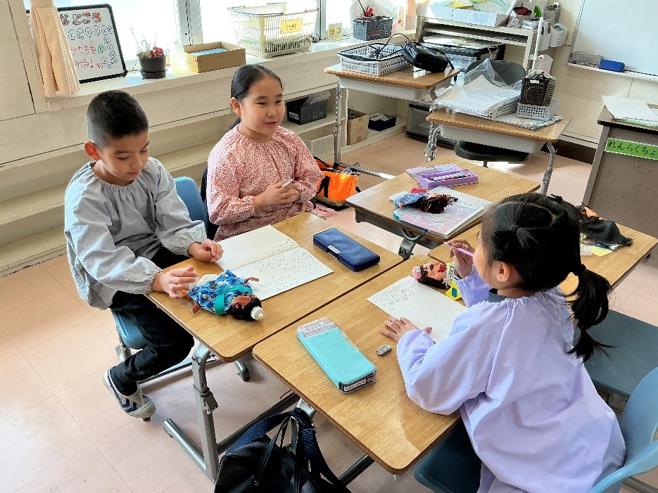 人形が完成したので、人形を使った人形劇をグループで考えます。どんなお話にするか、話し合います。